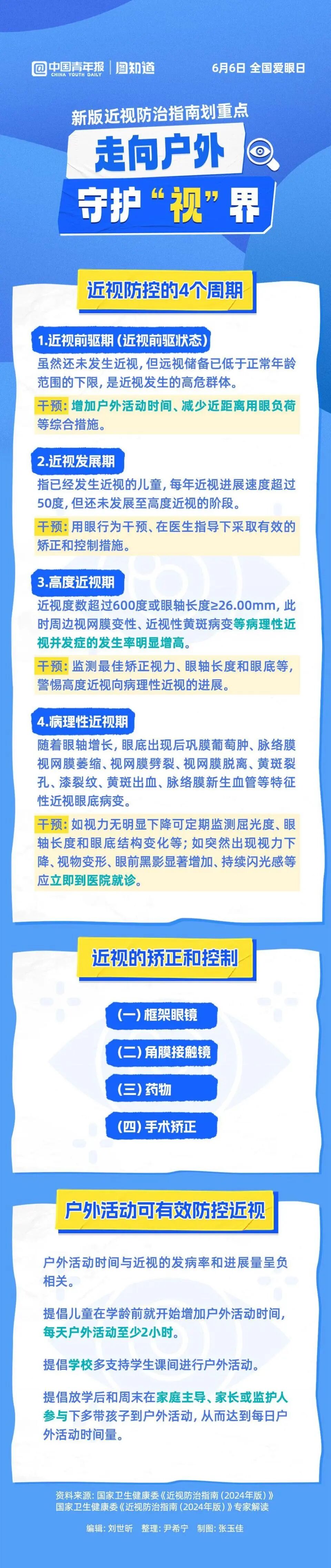 日前,国家卫健委发布《近视防治指南(2024年版)》,专门增加了公共卫生层面近视防控策略分期,并强调了儿童青少年户外活动可有效防控近视。今天是全国爱眼日,行动起来,让孩子的眼睛沉浸于大自然,得到更好的保护。