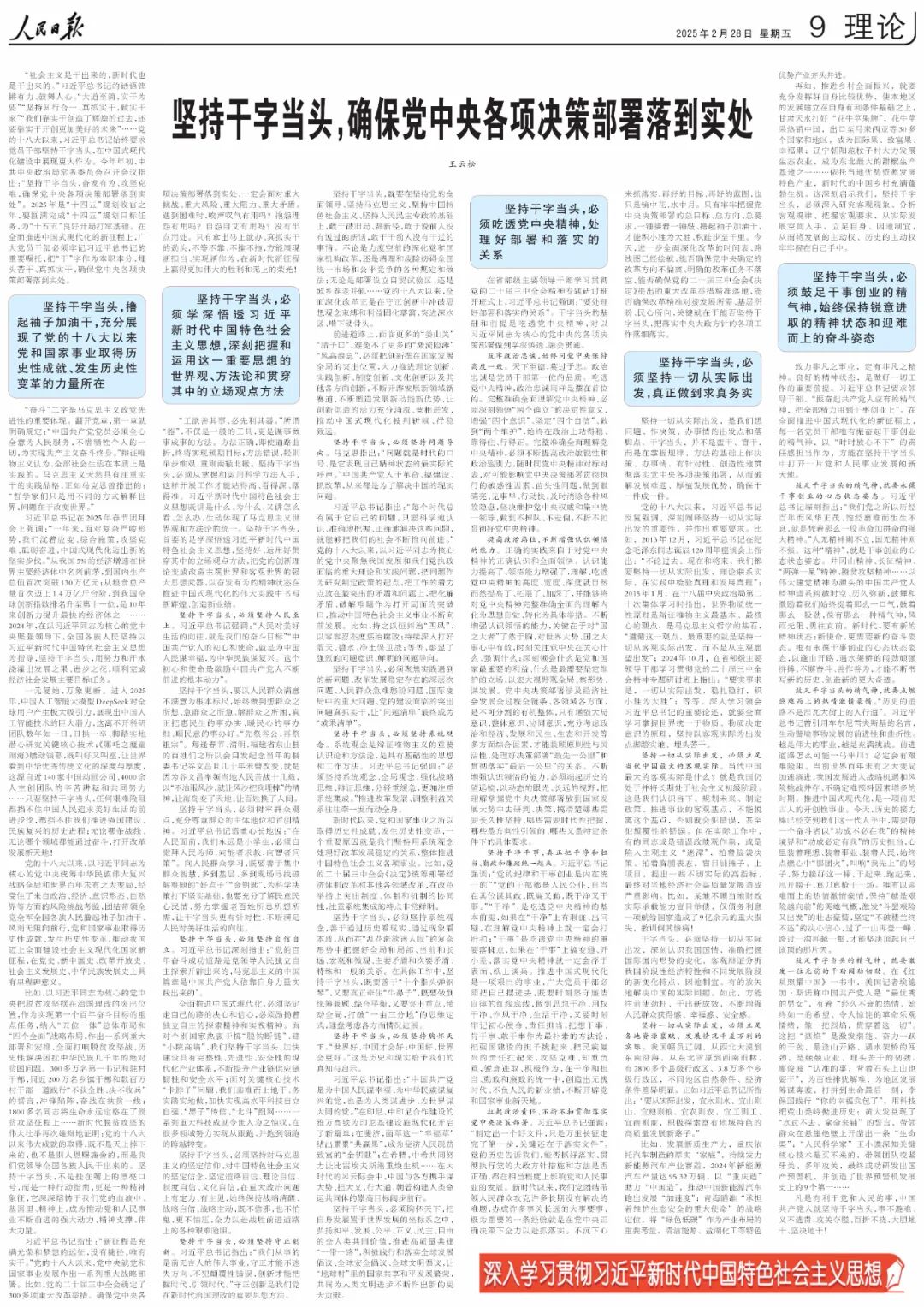 人民日报整版刊文:坚持干字当头,确保党中央各项决策部署落到实处![]() ![]() 原标题:坚持干字当头,确保党中央各项决策部署落到实处(深入学习贯彻习近平新时代中国特色社会主义思想) “社会主义是干出来的,新时代也是干出来的。”习近平总书记的话语铿锵有力、鼓舞人心。“大道至简,实干为要”“坚持知行合一、真抓实干,做实干家”“我们靠实干创造了辉煌的过去,还要靠实干开创更加美好的未来”……党的十八大以来,习近平总书记始终要求党员干部坚持干字当头,在中国式现代化建设中展现更大作为。今年年初,中共中央政治局常务委员会召开会议指出:“坚持干字当头,奋发有为、攻坚克难,确保党中央各项决策部署落到实处”。2025年是“十四五”规划收官之年,要圆满完成“十四五”规划目标任务,为“十五五”良好开局打牢基础。在全面推进中国式现代化的新征程上,广大党员干部必须牢记习近平总书记的重要嘱托,把“干”字作为本职本分,埋头苦干、真抓实干,确保党中央各项决策部署落到实处。 坚持干字当头,撸起袖子加油干,充分展现了党的十八大以来党和国家事业取得历史性成就、发生历史性变革的力量所在 “奋斗”二字是马克思主义政党先进性的重要体现。翻开党章,第一章就明确规定:“中国共产党党员必须全心全意为人民服务,不惜牺牲个人的一切,为实现共产主义奋斗终身。”辩证唯物主义认为,全部社会生活在本质上是实践的。马克思主义天然具有注重实干的实践品格,正如马克思曾指出的:“哲学家们只是用不同的方式解释世界,问题在于改变世界。” 习近平总书记在2025年春节团拜会上强调:“一年来,面对复杂严峻形势,我们沉着应变、综合施策,攻坚克难、砥砺奋进,中国式现代化迈出新的坚实步伐。”从我国5%的经济增速在世界主要经济体中名列前茅,到国内生产总值首次突破130万亿元;从粮食总产量首次迈上1.4万亿斤台阶,到我国全球创新指数排名升至第十一位,是10年来创新力提升最快的经济体之一……2024年,在以习近平同志为核心的党中央坚强领导下,全国各族人民坚持以习近平新时代中国特色社会主义思想为指导,坚持干字当头,用努力和汗水浇灌出发展之果、进步之花,顺利完成经济社会发展主要目标任务。 一元复始,万象更新。进入2025年,中国人工智能大模型DeepSeek对全球用户产生极大吸引力,展现出中国人工智能技术的巨大潜力,这离不开科研团队数年如一日,日拱一卒、脚踏实地潜心研究关键核心技术;《哪吒之魔童闹海》燃动银幕,既叫好又叫座,让世界看到中华优秀传统文化的深度与厚度,这源自近140家中国动画公司、4000余人主创团队的辛苦耕耘和共同努力……只要坚持干字当头,任何艰难险阻都挡不住中国人民追求美好生活的前进步伐,都挡不住我们推进强国建设、民族复兴的历史进程;无论哪条战线、无论哪个领域都能通过奋斗,打开改革发展新天地! 党的十八大以来,以习近平同志为核心的党中央统筹中华民族伟大复兴战略全局和世界百年未有之大变局,经受住了来自政治、经济、意识形态、自然界等方面的风险挑战考验,团结带领全党全军全国各族人民撸起袖子加油干、风雨无阻向前行,党和国家事业取得历史性成就、发生历史性变革,推动我国迈上全面建设社会主义现代化国家新征程,在党史、新中国史、改革开放史、社会主义发展史、中华民族发展史上具有里程碑意义。 比如,以习近平同志为核心的党中央把脱贫攻坚摆在治国理政的突出位置,作为实现第一个百年奋斗目标的重点任务,纳入“五位一体”总体布局和“四个全面”战略布局,作出一系列重大部署和安排,全面打响脱贫攻坚战,历史性解决困扰中华民族几千年的绝对贫困问题。300多万名第一书记和驻村干部,同近200万名乡镇干部和数百万村干部一道践行“不获全胜、决不收兵”的誓言,冲锋陷阵,奋战在扶贫一线;1800多名同志将生命永远定格在了脱贫攻坚征程上……新时代脱贫攻坚的伟大壮举再次雄辩地证明:党的十八大以来伟大成就的取得,既不是天上掉下来的,也不是别人恩赐施舍的,而是我们党领导全国各族人民干出来的。坚持干字当头,不是挂在嘴上的漂亮口号,而是一种行动指南,更是一种精神象征,它深深熔铸于我们党的血液中、基因里、精神上,成为推动党和人民事业不断前进的强大动力、精神支撑、伟大力量。 习近平总书记指出:“新征程是充满光荣和梦想的远征,没有捷径,唯有实干。”党的十八大以来,党中央就党和国家事业发展作出一系列重大战略部署。比如,党的二十届三中全会确定了300多项重大改革举措。确保党中央各项决策部署落到实处,一定会面对重大挑战、重大风险、重大阻力、重大矛盾。遇到困难时,唉声叹气有用吗?抱怨埋怨有用吗?自怨自艾有用吗?没有半点用处。只有拿出马上就办、真抓实干的劲头,不等不靠、不推不拖,方能展现新担当、实现新作为,在新时代新征程上赢得更加伟大的胜利和无上的荣光! 坚持干字当头,必须学深悟透习近平新时代中国特色社会主义思想,深刻把握和运用这一重要思想的世界观、方法论和贯穿其中的立场观点方法 “工欲善其事,必先利其器。”所谓“器”,不仅是一般的工具,更是谋事做事成事的方法。方法正确,即使道路曲折,终将实现预期目标;方法错误,