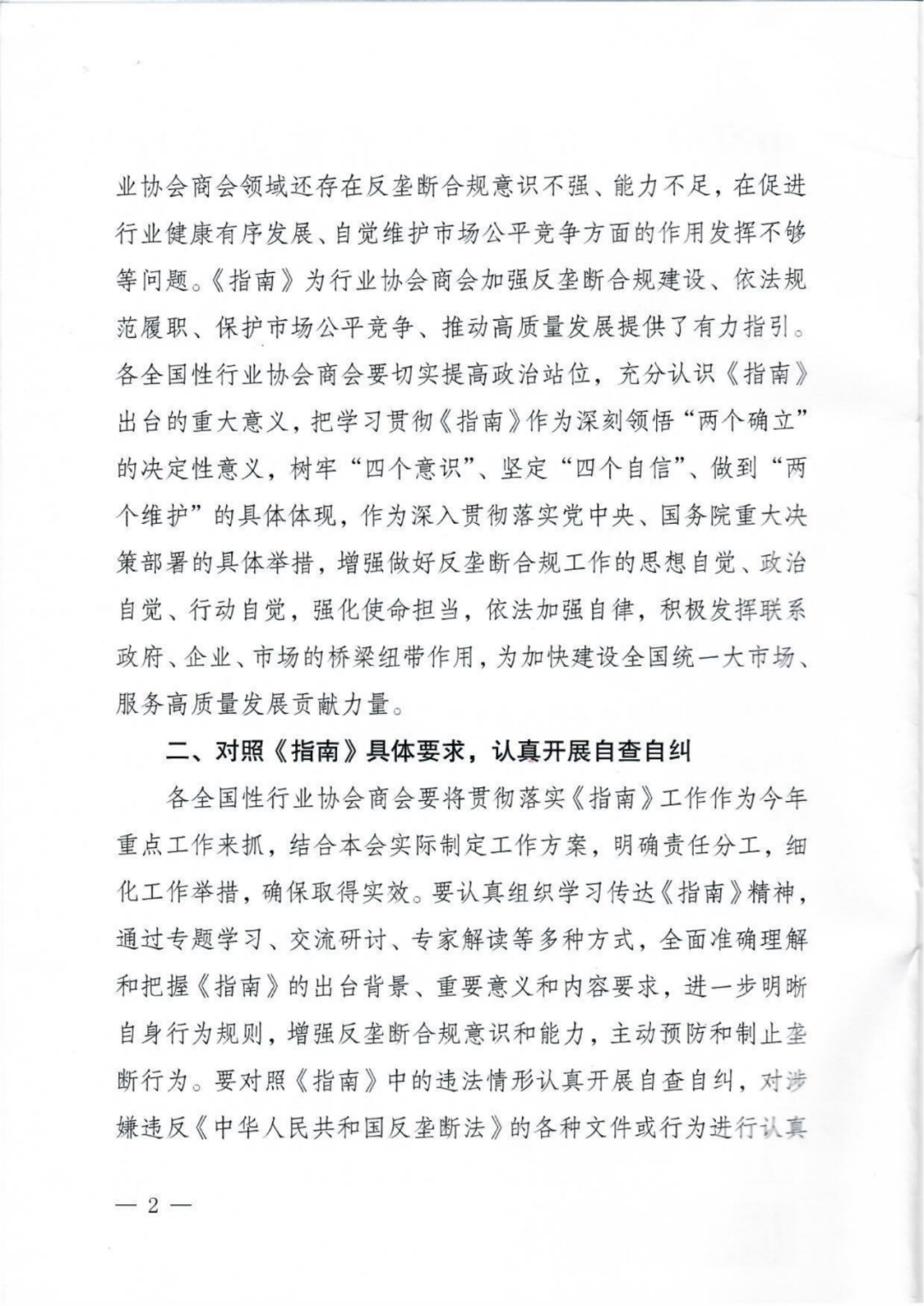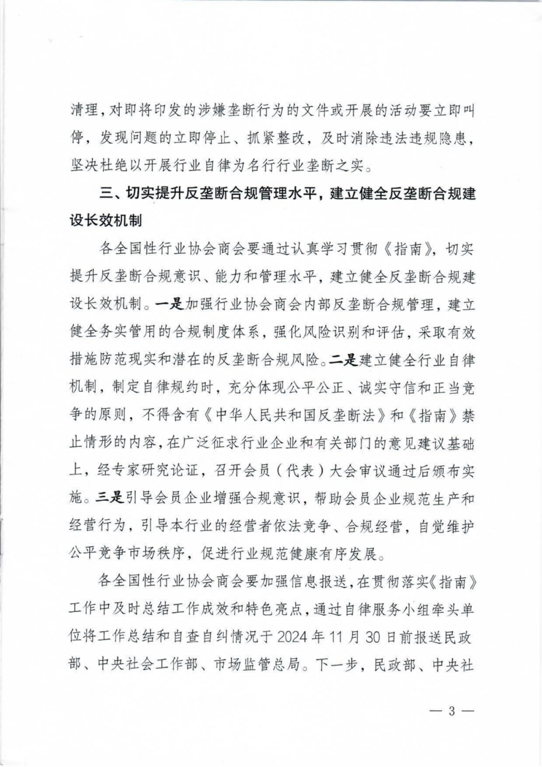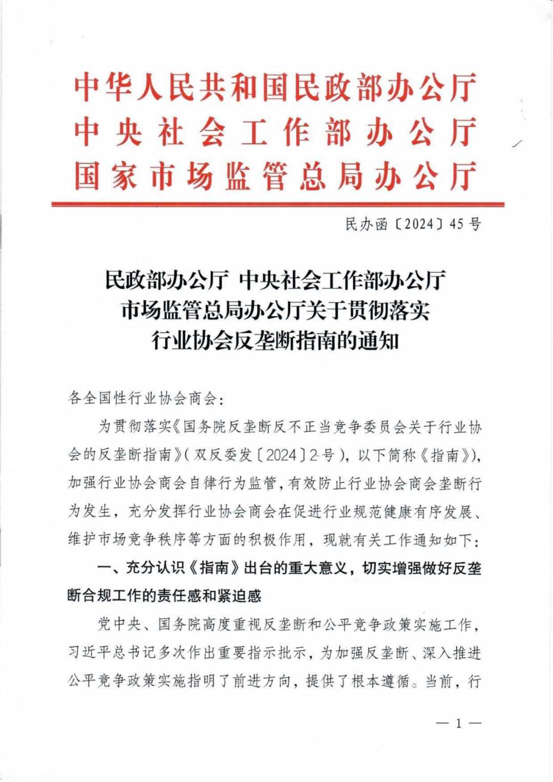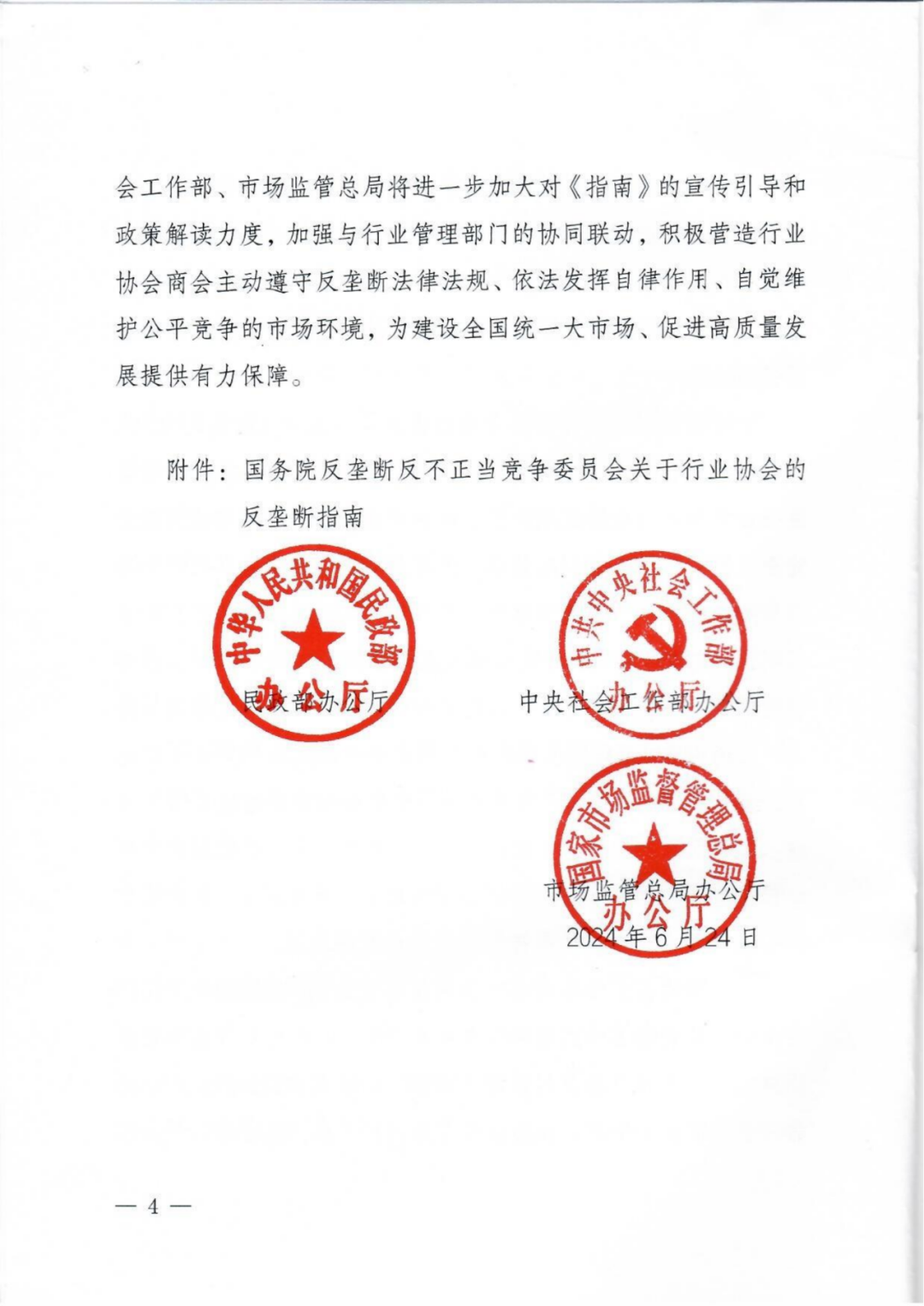 国务院反垄断反不正当竞争委员会 关于行业协会的反垄断指南 (2024年1月10日国务院反垄断反不正当竞争委员会印发) 第一条 目的和依据 为了预防和制止行业协会从事《中华人民共和国反垄断法》(以下简称《反垄断法》)禁止的行为,发挥行业协会在促进行业规范健康持续发展、维护市场竞争秩序等方面的积极作用,引导行业协会加强反垄断合规建设,根据《反垄断法》等法律规定,制定本指南。 第二条 基本概念 本指南所称行业协会,是指由同行业经济组织和个人组成,行使行业服务和自律管理职能的社会团体法人。 行业协会主要由具有竞争关系的经营者组成,也可能包括上下游经营者,或者具有其他业务联系的经营者。 第三条 总体要求 行业协会应当加强行业自律,引导本行业的经营者依法竞争,合规经营,维护市场竞争秩序。 行业协会不得违反《反垄断法》的规定,从事排除、限制竞争行为。 第四条 禁止组织从事垄断协议的一般规定 组织本行业的经营者从事垄断协议,是行业协会违反《反垄断法》的主要表现形式。行业协会不得违反《反垄断法》第二十一条的规定,组织本行业的经营者从事垄断协议行为。 前款所称从事,包括垄断协议的达成和实施。 第五条 垄断协议的形式 垄断协议是指排除、限制竞争的协议、决定或者其他协同行为。 协议、决定可以是书面、口头等形式。 其他协同行为是指经营者虽未明确订立协议或者决定,但实质上存在协调一致的行为,有关经营者基于独立意思表示所作出的价格跟随等平行行为除外。 第六条 横向垄断协议 行业协会不得组织本行业具有竞争关系的经营者达成《反垄断法》第十七条禁止的下列垄断协议: (一)固定或者变更商品或者服务(以下统称商品)价格。行业协会不得以价格自律、行业整顿、维护市场秩序等名义为本行业的经营者设定商品价格或者限制其自主定价权,也不得组织本行业的经营者固定或者变更价格水平、价格变动幅度、利润水平或者折扣、手续费等其他费用,约定采用据以计算价格的标准公式、算法、平台规则等。 (二)限制商品的生产数量或者销售数量。行业协会不得对本行业的经营者作出减产、停产、设定生产配额或者比例、限量供应、停止销售等关于商品生产数量或者销售数量的决定,也不得组织本行业的经营者通过限制产量、固定产量、停止生产等方式限制商品的生产数量,通过限制商品投放量等方式限制商品的销售数量等。 (三)分割销售市场或者原材料采购市场。行业协会不得组织本行业的经营者划分商品的销售地域、销售对象、市场份额、销售收入、销售利润或者销售商品的种类、数量、时间,也不得组织本行业的经营者划分原材料的采购区域、供应商、种类、数量、时间等。 (四)限制购买新技术、新设备或者限制开发新技术、新产品。行业协会不得组织本行业的经营者限制购买、使用、租赁、投资、研发新技术、新工艺、新设备、新产品,或者拒绝使用新技术、新工艺、新设备、新产品等。 (五)联合抵制交易。行业协会不得组织本行业的经营者联合拒绝向特定经营者供应或者销售商品、联合拒绝采购或者销售特定经营者的商品,或者联合限定特定经营者不得与其具有竞争关系的经营者进行交易等。 (六)国务院反垄断执法机构认定的其他垄断协议。 第七条 纵向垄断协议 行业协会不得组织本行业的经营者与交易相对人达成《反垄断法》第十八条禁止的下列垄断协议: (一)固定向第三人转售商品的价格。行业协会不得组织本行业的经营者固定向第三人转售商品的价格水平、价格变动幅度、利润水平或者折扣、手续费等其他费用。 (二)限定向第三人转售商品的最低价格。行业协会不得组织本行业的经营者限定向第三人转售商品的最低价格,或者通过限定价格变动幅度、利润水平或者折扣、手续费等其他费用限定向第三人转售商品的最低价格等。 (三)国务院反垄断执法机构认定的其他垄断协议。 对于前款第一项和第二项规定的协议,行业协会或者经营者能够证明协议不具有排除、限制竞争效果的,不予禁止。 经营者能够证明其在相关市场的市场份额低于国务院反垄断执法机构规定的标准,并符合国务院反垄断执法机构规定的其他条件的,不予禁止。 第八条 组织达成垄断协议的情形 行业协会不得通过下列行为组织本行业的经营者达成垄断协议: (一)制定、发布含有排除、限制竞争内容的行业协会章程、规则、决定、通知、意见、标准、自律公约等; (二)通过会议、邮件、电话、函件、即时通讯工具等,召集、组织、推动经营者以书面、口头等形式达成含有排除、限制竞争内容的协议、决议、纪要、备忘录等; (三)通过会议、邮件、电话、函件、即时通讯工具等,召集、组织、推动经营者虽未订立协议或者决定,但达成排除、限制竞争的协调一致行为; (四)其他组织经营者达成垄断协议的行为。 第九条 组织实施垄断协议的情形 行业协会不得通过下列行为组织本行业的经营者实施垄断协议: (一)采取设置入会要求、没收保证金、设定违约金、限制会员权益、取消会员资格、通报批评、联合抵制、暂停经营活动等惩戒措施,强迫经营者实施垄断协议; (二)采取将垄断协议实施情况与会员奖优评先挂钩等激励措施,引导经营者实施垄断协议; (三)行
