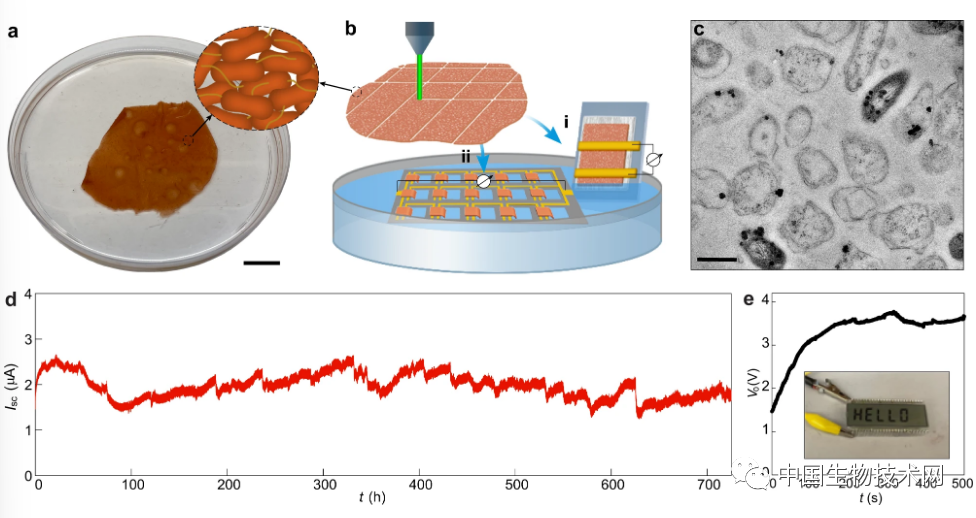微生物在自然界中无处不在。其中,就有几种电活性细菌能从有机物氧化中发电。因此,科学家们尝试将细菌生物膜作为一种生物材料从皮肤上的水分中获取电力以持续为可穿戴设备供电的可能。在这项新研究中,研究人员展示了由可持续原料生产的生物膜作为一种基于水蒸发诱导发电的无生命生物材料。这种细菌生物膜由一片约40微米厚(约一张纸厚)的细菌细胞组成。确切地说,它是由经过基因改造的硫还原地杆菌(Geobacter sulfurreducens)组成。G.sulfurreducens是目前已知产电与成膜能力最强的电活性微生物之一。此前,科学家们曾将G. sulfurreducens用于微生物燃料电池技术。这项技术要求细菌在缺氧条件下保持存活状态,并需要持续供应有机燃料。相比之下,生物膜片装置实现了类似或更好的能量密度和更快的启动时间,而不依赖于细胞活性;而且,将生物膜在空气中保存一个月以上,或90℃下烘烤对产电均无影响。这种方法的效率更高。从根本上减少了研究人员的工作量,从而简化了细菌的发电过程。这一过程依赖于基于蒸发的发电,即“水伏效应”。水流受固体生物膜和液态水之间的蒸发驱动,水流驱动电荷的传输以产生电流。G. sulfurreducens菌落生长在薄垫中,研究人员收集这些细菌后用激光在其中蚀刻出小电路。然后将它们夹在网状电极之间,最后密封在柔软有粘性且透气的聚合物中。该聚合物可直接涂抹在皮肤上,不会刺激皮肤。