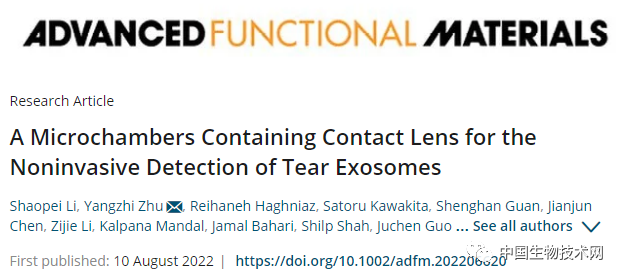 外泌体(exosome)是30-120nm的小细胞分泌的细胞外囊泡,携带其来源细胞的各种分子成分,包括蛋白质、脂质、mRNA和microRNA。它们可以从许多类型的细胞中释放出来,包括树突状细胞、淋巴细胞、血小板、肥大细胞、上皮细胞、内皮细胞和神经元等,并且存在于血液、唾液、尿液和泪液等几乎所有体液中。最初,外泌体被认为只是作为细胞的 "垃圾袋",以摆脱不需要的成分。然而,越来越多的证据表明,外泌体在细胞间通讯,以及癌症转移中发挥着至关重要的作用。因此,科学家们开始尝试将其作为癌症诊断的潜在生物标志物以及应用于多种生物医学领域。然而,基于免疫和microRNA分析的传统检测方法分离外泌体至少要18个小时,而且需要昂贵且占用空间的实验室设备。因此,导致这些发挥重要作用的潜在生物标志物的应用受到了限制。2022年8月10日,发表在《Advanced Functional Materials》上的一项新研究中,来自寺崎生物医学创新研究所(TIBI)领导的研究团队开发了一种智能隐形眼镜,该镜片嵌有与抗体结合的微型腔室,可以很容易地捕获泪液中的外泌体,从而为癌症预筛查提供了一种简单、快速、灵敏、经济、无创的支持性诊断平台。该团队表示,这一突破有望为廉价的“一刀切”式疾病筛查项目打开大门。![]()