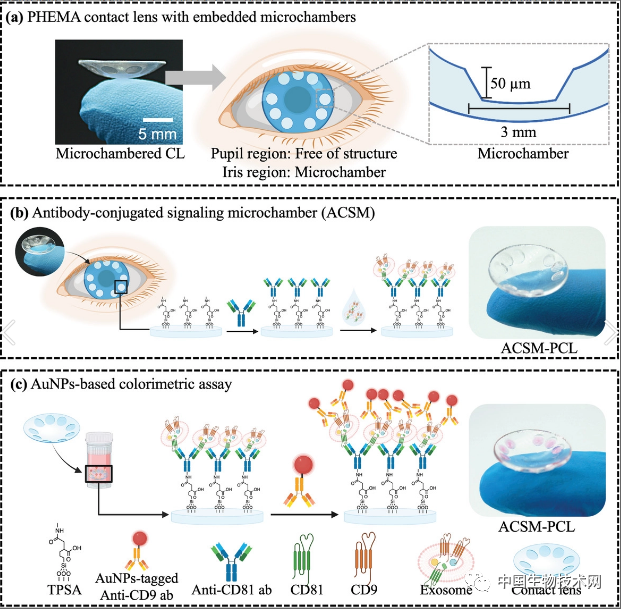 在这项新研究中,该团队设计了一种基于抗体偶联信号微室的隐形眼镜(ACSM-PCL)平台,用于检测和捕获泪液中完整的外泌体。研究人员表示,泪液是一种比血液、尿液和唾液更理想、更清洁的外泌体来源。![]()