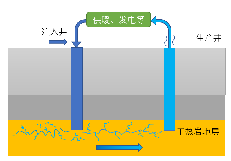 给地球插上插头?向岩石要热量!从太空观察地球,我们会看到一颗蔚蓝美丽的星球。由于海洋的蓝色和森林的绿色都是冷色调,这样的地球可能看上去会让我们感到清朗凉爽。 不过眼睛总是会骗人,实际情况或许出乎大家意料。地球其实是一个外冷内热的小火球,内部蕴含着很高的热量。虽然不能与太阳这种大火球相比,但据估计地球中心的温度也达到了惊人的6000 ℃。 地球内部结构 图片来源:flickr/ Argonne’s Advanced Photon Source 有学者认为地球热量来源主要有三个,一是地球内部放射性元素衰变产生的热量,二是地球内部致密物质下沉到地心时重力势能转化成的热量,三是地球形成时尚未散失的热量。总而言之,这些都是地球自身产生的热量。 这些能量能不能被人类利用起来?今天,就给大家介绍一种“未来能源”——干热岩。 地下除了温泉,岩石也很热啊 虽然地心高温,但是据资料显示,地表年平均温度只有15 ℃左右。这是因为从地心到地表热量逐渐散失,温度越来越低,这也让地层中出现了地温梯度。在靠近地表的区域,平均地温梯度是3 ℃/100m,即每深入地下100 m,温度就升高3 ℃;反过来,每向地表靠近100m,温度降低3 ℃。 发现这些来自地下的热量后,人类就想加以利用,将其称为地热资源,并按照产出方式分为水热型地热资源和干热型地热资源。 水热型地热资源可以简单理解为地下热水。温泉就属于水热型地热资源,这是地下热水冒出地表后的产物。还有一些地下热水并不冒出地表,而是一直封存于地下。水热型地热资源的应用实例,除了泡温泉之外,在国内比较著名的就是西藏羊八井地热田了,1977年我国就在此建了一座地热发电站,并取得了良好效益。 泡温泉就是利用的水热型地热资源 图片来源:wikipedia 相应的,干热型地热资源可以理解为虽然地下的岩层很热,但没有水或者只存在很少的水。一般是指埋藏于地壳3~10 km 深处、温度高于180 ℃(也有学者认为是150 ℃或者200 ℃)的高温岩体,因此干热型地热资源也被称为干热岩。 之所以强调3~10 km这个深度,倒不是说更深的就不热了,而是因为更深的地方我们够不着了。目前人类最深的钻井记录是苏联的科拉超深井,花了20年时间才达到12.2 km,而且耗资巨大。因此我们一般只关注那些地温梯度比较高,即挖得不深就能很热的地方,这里投入产出比比较高。中国的干热岩资源主要集中在西藏羊八井地区、云南腾冲地区以及青海共和盆地等地。 中国干热岩资源分布图 图片来源:参考文献[13] 干热岩的资源量是相当可观的。据麻省理工学院保守估计,地壳中可开采的干热岩储量接近1.3×1027J,可供全球使用大约2.17亿年。而中国大陆3~10 km 深度的干热岩资源据统计约为2.52×1025J,大致相当于860万亿吨的标准煤。根据中国2021年的能源消费总量52.4亿吨标准煤计算,如果这部分干热岩可以实现2%的开采率,那么将能够维持中国3282年的能源供给。 不过,干热岩这种资源这么好,怎么还不开采利用呢? 能量诱人,开采不易 虽然干热岩资源的前景非常诱人,但开采起来困难极大,直到上世纪70年代才有了较大的理论突破。1970年,美国洛斯阿拉莫斯实验室提出了增强型地热系统(Enhanced geothermal system, EGS)的概念,基本原理大概是这样的:向地热储层中打两个井,注入井和生产井。向注入井中注入冷水,等冷水流经地热储层被加热后,再用生产井把热水抽上来,然后就能用这热水供暖或发电了,用完还可以将这些水导入地下循环利用。 EGS工程示意图 图片来源:作者自制 这个方案乍听起来简便划算,等于说让冷水去地热储层串门后,就能带着热量满载而归了,但实际存在很多工程技术上的难题。比如干热岩资源所处的地层往往又热又硬,钻井难度大、成本高;又比如干热岩储层可能致密不透水,注入的冷水无法向钻井周边扩散吸热,难以流到生产井被抽出。 尽管我们可以通过水力压裂技术(注入高压水破坏储层结构,在其中形成裂隙网络)来改善储层的渗透率,但由于地下操作看不见摸不着,高压水注下去后,难以保证裂隙就只按我们想要的方向发展,万一它向远离生产井的方向发展,那我们注入的水就收不上来了。 水力压裂技术示意图,向地下注入高压水溶液,利用高压使得岩层中产生裂隙,目前页岩油采集也主要使用本技术 图片来源:Wikipedia 1973年,美国开启了Fenton Hill干热岩试验项目,首次进行了EGS的工程尝试。虽然这个项目最终因钻井设备缺陷以及工程成本巨大等原因失败了,但也证实了EGS技术上的可行性,对干热岩地热开采起到了至关重要的推进作用。此后英国、法国、德国、澳大利亚以及日本等相继开展了一系列的EGS 工程尝试,其中由法、英、德三国于Soultz联合开展的EGS系统是目前世界上较为成功的EGS示范项目,于2008年实现了干热岩地热发电。 在欧洲的EGS技术成功后,美国、韩国和中国等国家也加速了这方面研究。美国能源部于2015 年4 月开始实施了“给地球插上插头”的干热岩“地热能前沿瞭望台研究计划”(FORGE),计划在2050 年将EGS 发电的总装机容量提高到10 万兆瓦,相当于4个三峡大坝。 韩国于2016 年启动了国内第一个EGS 项目尝试—Pohang EGS,其最终目标是期望实现1 兆瓦(MWe )的发电示范。但在该项目启动后,2017年在项目所在地附近发生了一次5.5级地震,有研究认为可能是这个项目向地下注水时诱发了地震,因此这个项目被迫停止。 韩国2017