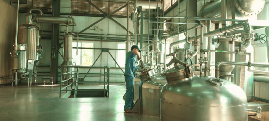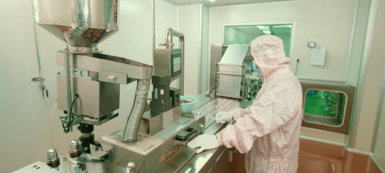 食品车间:食品车间面积约500平方米,其中包括:原料前处理间,提取间,调配和沉降间,洗瓶间,灌装间和外包装间等。其中调配和沉降间,洗瓶间,灌装间为洁净车间。洁净区(室)内为复合彩钢板隔断,地面为塑胶地面,室内交界处为弧形铝材结合,表面平整光滑、接口严密、无裂缝、无颗粒物脱落。空气净化系统运行可靠,并有严格控制装置。室内空气洁净度、温湿度、照度等均符合要求。