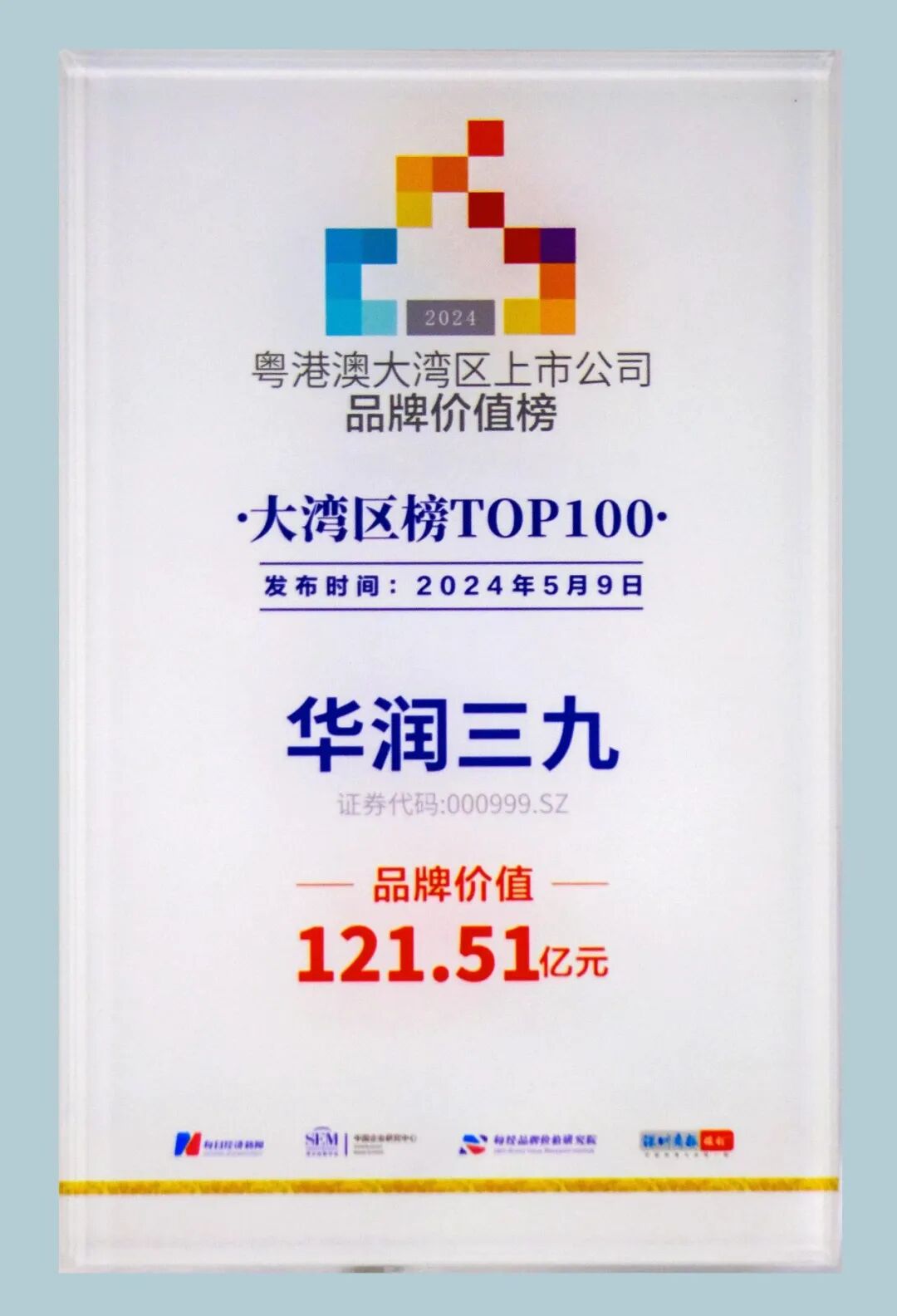 5月9日,第八个“中国品牌日”前夕,“2024第八届中国上市公司品牌价值榜发布会”在深圳举办,由每日经济新闻与深圳商报社联合主办、清华大学经济管理学院中国企业研究中心提供学术支持,主题为“品牌活力新质生长”。会上首次发布2024粤港澳大湾区上市公司品牌价值TOP100榜,华润三九以121.51亿元品牌价值入选该榜单。