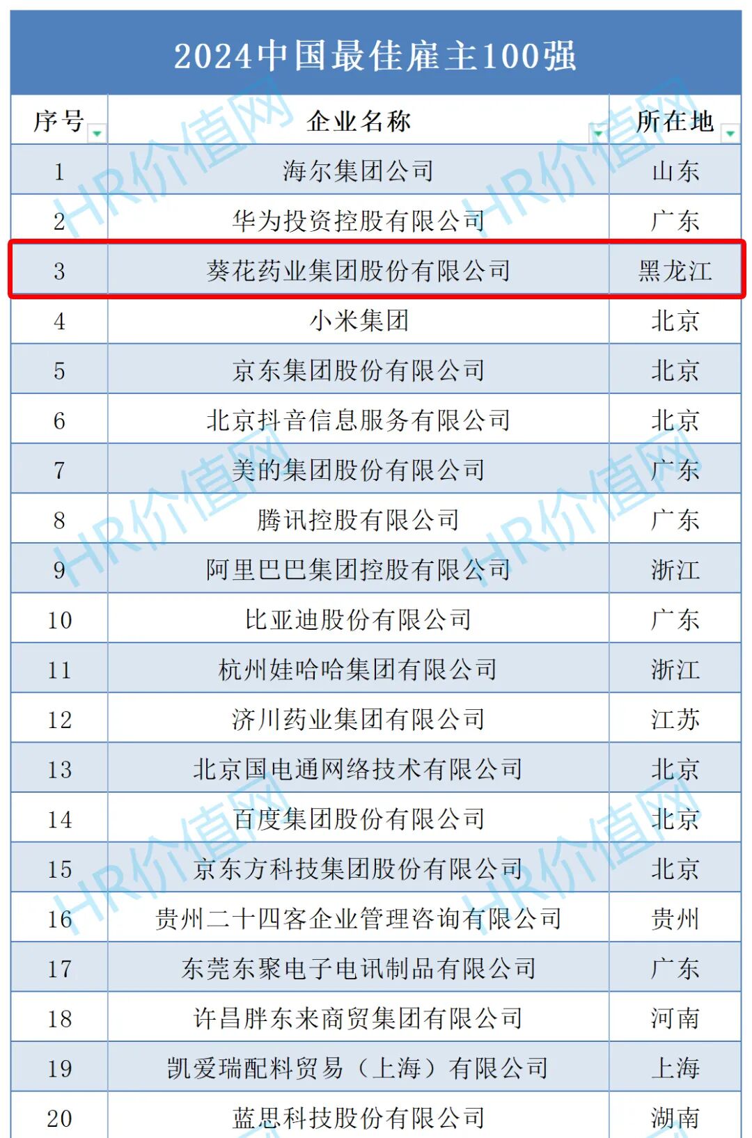 喜报 | 葵花药业与海尔、华为跻身“2024中国最佳雇主100强”前三甲