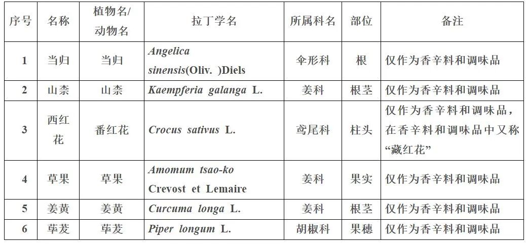 第二批:2020年 2020年1月6日,卫健委2019第8号公告,正式给予当归、山柰、西红花、草果、姜黄、荜茇等6种物质作为既是食品又是中药材的物质,纳入药食两用目录。 当归等6种新增按照传统既是食品又是中药材的物质目录(2019年第8号)