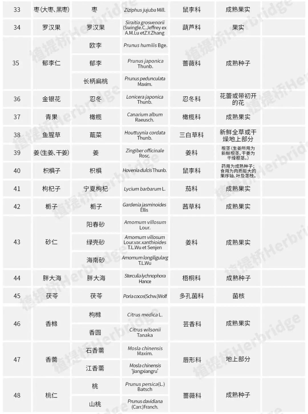 第一批:2002年 2002年3月,原卫生部发布了《关于进一步规范保健食品原料管理的通知》(卫法监发〔2002〕51号)《既是食品又是药品的物品名单》,该名单中涉及的87种物品可用于普通食品生产。 87种既是食品又是药品的物品名单〔2002〕51号 丁香、八角茴香、刀豆、小茴香、小蓟、山药、山楂、马齿苋、乌梢蛇、乌梅、木瓜、火麻仁、代代花、玉竹、甘草、白芷、白果、白扁豆、白扁豆花、龙眼肉(桂圆)、决明子、百合、肉豆蔻、肉桂、余甘子、佛手、杏仁(甜、苦)、沙棘、牡蛎、芡实、花椒、赤小豆、阿胶、鸡内金、麦芽、昆布、枣(大枣、酸枣、黑枣)、罗汉果、郁李仁、金银花、青果、鱼腥草、姜(生姜、干姜)、枳椇子、枸杞子、栀子、砂仁、胖大海、茯苓、香橼、香薷、桃仁、桑叶、桑椹、桔红、桔梗、益智仁、荷叶、莱菔子、莲子、高良姜、淡竹叶、淡豆豉、菊花、菊苣、黄芥子、黄精、紫苏、紫苏籽、葛根、黑芝麻、黑胡椒、槐米、槐花、蒲公英、蜂蜜、榧子、酸枣仁、鲜白茅根、鲜芦根、蝮蛇、橘皮、薄荷、薏苡仁、薤白、覆盆子、藿香