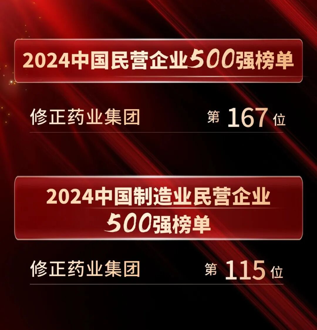 修正药业集团再次入选,分别位居2024年中国民营企业500强第167位,2024年中国制造业民营企业500强第115位。