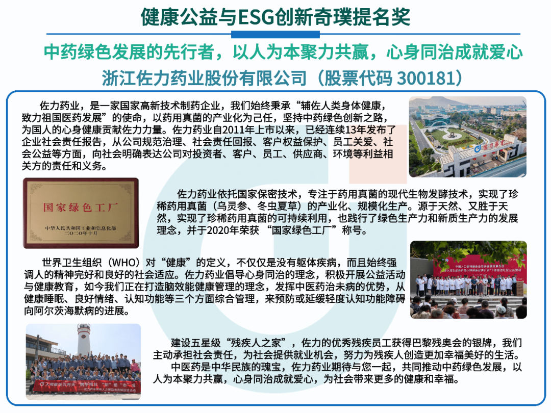 2024年11月24日,《中药绿色发展的先行者,以人为本聚力共赢,心身同治成就爱心》荣获健康公益与ESG创新奇璞提名奖。佐力药业从公司规范治理、社会责任回报、客户权益保护、绿色生产、员工关爱、社会公益等方面,向社会明确表达公司对投资者、客户、员工、供应商、环境等利益相关方的责任和义务。