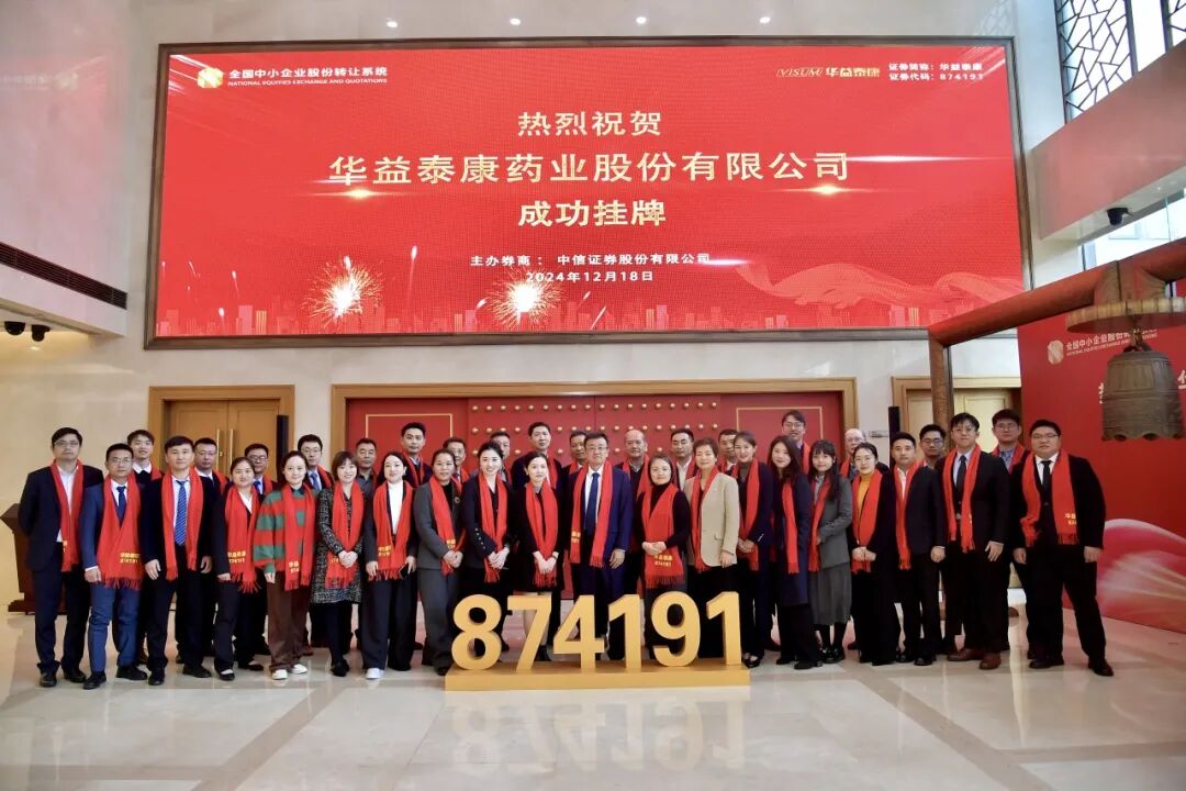 凝心聚力,共鉴辉煌 ——华益泰康药业股份有限公司成功挂牌新三板![]() 2024年12月18日上午,华益泰康药业股份有限公司(证券简称:华益泰康,证券代码:874191)迎来了发展的重要里程碑时刻——在全国中小企业股份转让系统(新三板)正式举行挂牌仪式。11点18分,挂牌钟声敲响,仪式圆满成功,华益泰康药业自此站在全新起点上,翻开了资本市场的新篇章。 ![]() 海南省委金融工作委员会专职副书记王小星、海南省委员会金融委员会办公室金融监管二处处长罗洋、华益泰康药业股份有限公司股东、股东代表、经营管理层及中信证券股份有限公司等中介机构代表一同出席仪式,见证华益泰康这一辉煌时刻。 ![]() 在挂牌仪式上,海南省委金融工作委员会专职副书记王小星女士代表海南省金融办向华益泰康送上最热烈的祝贺! ![]() 王小星书记在致辞中表示,希望华益泰康能够以此为契机,充分利用新三板市场的优势资源,进一步优化资本结构,加速技术创新和产品研发,不断提升企业核心竞争力。同时,也希望华益泰康能够继续秉承“诚信、创新、共赢”的发展理念,加强与投资者、客户及合作伙伴的沟通与合作,实现企业的可持续发展,为社会创造更多价值。海南省委金融办将一如既往地支持包括华益泰康在内的所有挂牌企业,通过优化服务、营造良好金融生态环境,为企业健康发展保驾护航。 ![]() 挂牌仪式现场的气氛庄重而热烈,作为华益泰康的“领军人”,董事长诸弘刚博士向出席嘉宾表示热烈欢迎,并向一直以来关注和支持华益泰康的各级领导、各位投资人、合作伙伴及全体员工表示感谢。 董事长诸弘刚博士表示,华益泰康自成立以来,一直以研发驱动为核心,秉持国际化视野,深耕复杂制剂和创新制剂领域。此次正式登陆新三板资本市场,标志着华益泰康迈入另一个发展阶段。未来,在充满挑战的医药制造行业,华益泰康未来将继续秉持“诚信做人,用心做药”的企业核心价值观,以研发创新为核心,打造具有高技术壁垒、国际化视野的高端制剂平台,立志成为一家具有核心竞争力、高度社会责任感的国际化医药企业。 ![]() 中信证券股份有限公司执行总经理王栋先生代表中信证券向公司管理层和股东、一起合作共事的中介机构诚挚祝贺华益泰康在全国股转公司成功挂牌! 王栋总经理表示,中信证券作为参与华益泰康的挂牌工作的主办券商,他们见证并感受了华益泰康的快速发展及骄人业绩,对华益泰康的光明前景充满信心。此次华益泰康在全国股转公司挂牌、步入资本市场,将为公司持续健康成长注入全新动力与活力,将极大地推进和强化公司产品与市场影响力。同时,他们坚信,华益泰康能够把握此契机,提升公司治理,增强核心竞争力,以更加优良的业绩回报股东,回报社会,回报对华益泰康寄予厚望的广大投资者! ![]() 未来,随着挂牌新三板的成功,华益泰康将迎来更多的发展机遇和挑战。公司将继续以技术为核心、以质量为基础、以合作谋共赢,不断提升自身的研发能力和市场竞争力,在资本市场上书写崭新篇章,乘势而上,行稳致远,为中国医药行业做出更大的贡献。