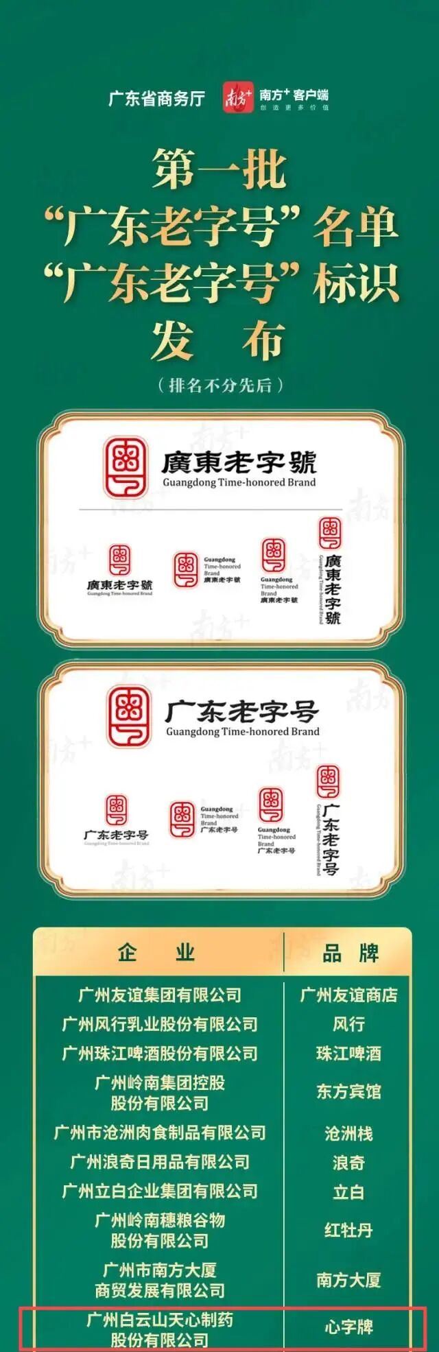 近日,广东省商务厅正式发布了第一批“广东老字号”名单,广州白云山天心制药股份有限公司凭借其深厚的历史底蕴、卓越的品牌魅力及不懈的创新追求成功入选,成为首批获此殊荣的企业之一。