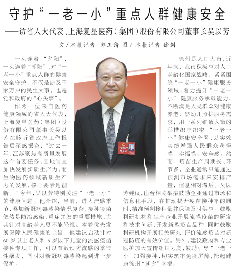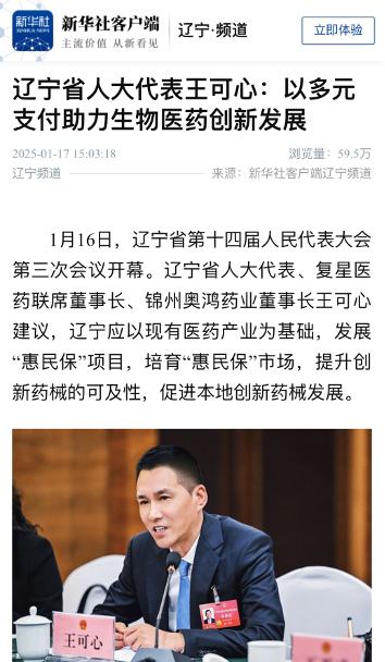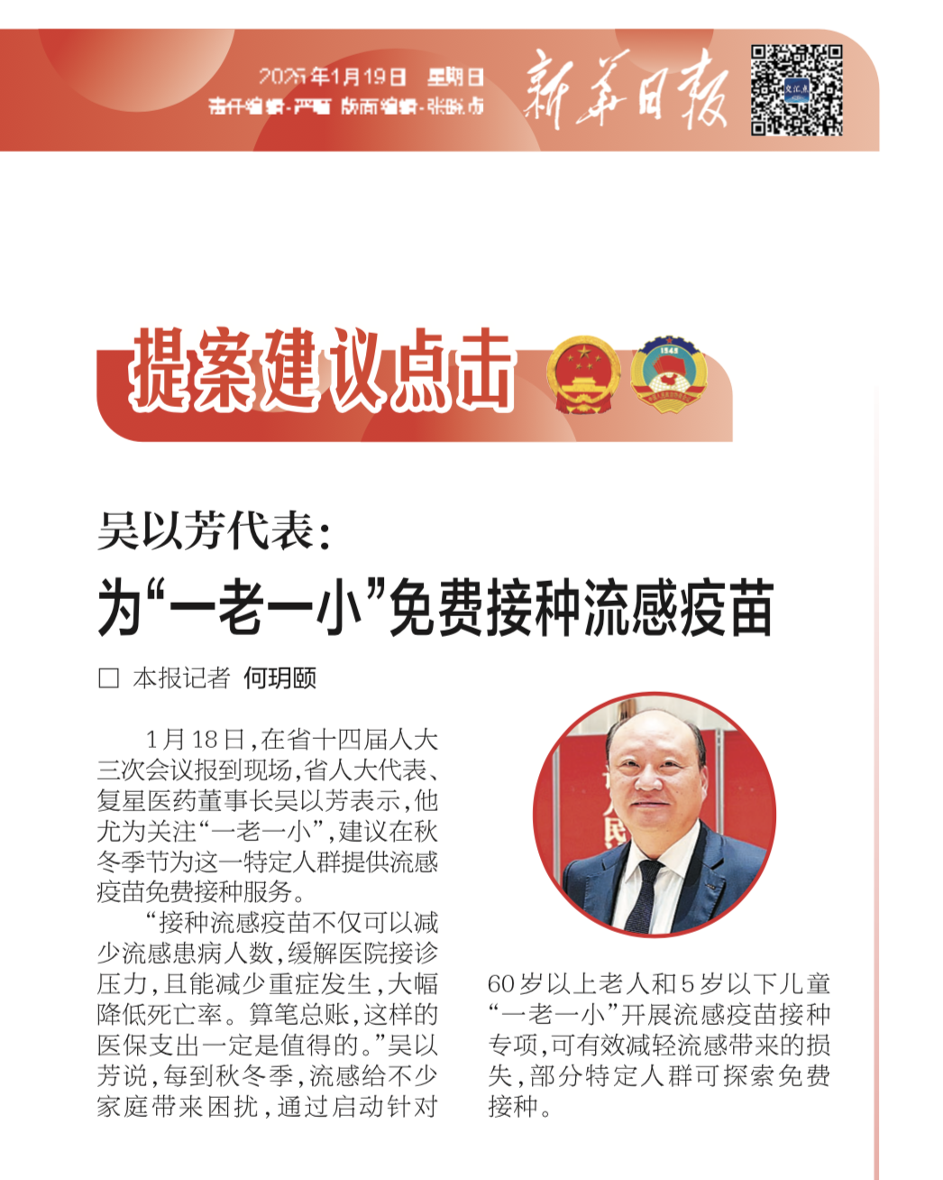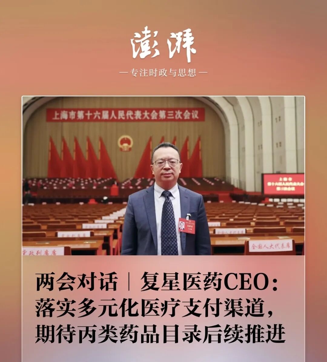 两会聚焦 2025 ![]() ![]() 2025年全国地方两会期间,复星医药董事长吴以芳、联席董事长王可心以及CEO文德镛作为人大代表分别出席了江苏省、辽宁省、上海市地方人大会议,聚焦产业发展及民生保障提出多项报告建议,切实以自身专业能力及影响力为生物医药行业及民生建言献策,让我们一起看一下媒体对于相关建议的报道吧~ 江苏省人大代表、复星医药董事长吴以芳表示,2025年是实现“十四五”规划收官之年,聚焦高质量发展是首要任务,生物医药领域新质生产力的形成,核心要素是创新。我们将积极响应,持续加大在江苏的创新投入,特别是在生物医药、高端医疗器械等领域,培育壮大产业。同时,进一步关注未被满足的医疗需求,聚焦“一老一小”的健康保障,建议启动针对江苏省60岁以上老人和5岁以下儿童“一老一小”开展流感疫苗接种的专项工作,为人民健康保驾护航。 ![]() 江苏卫视 | 江苏省人大代表 吴以芳:做高价值源头创新和全面国际化、深度国际化 ![]() 新华日报 | 吴以芳代表:为“一老一小”免费接种流感疫苗 ![]() ![]() 扫码观看报道 ![]() 新华日报 | 干在实处 满怀信心 吴以芳代表:做高价值的源头创新,让中国药品造福全球 ![]() ![]() 扫码观看报道 ![]() 徐州日报 | 构建跨区域产学研医创新联合体——访市人大代表、上海复星医药(集团)股份有限公司董事长吴以芳 ![]() ![]() 扫码观看报道 辽宁省人大代表、复星医药联席董事长、锦州奥鸿药业董事长王可心表示,政府积极推动医药产业创新模式转化,提高科研创新成果本地转化能力、加速高价值创新药落地,将高效推动辽宁省生物医药产业集群向更高价值领域跃迁。同时王可心代表还专门提交建议,辽宁省以现有医药产业为基础,宜大力发展“惠民保”项目、培育“惠民保”市场,以提升创新药械的可及性,促进本地创新药械的发展壮大,这对保障人民群众生命健康、推动生物医药产业发展具有重要意义。王可心代表的提案,引发各大媒体广泛关注。 ![]() 新华社 | 辽宁省人大代表王可心:以多元支付助力生物医药创新发展 ![]() ![]() 扫码观看报道 ![]() 东北新闻网 | 聚焦省两会 王可心代表:让“惠民保”惠及更多普通患者 ![]() ![]() 扫码观看报道 ![]() 辽宁电视台 | 《第1时间》 人大会侧记 上海市人大代表、复星医药CEO文德镛表示,上海在生物医药的创新发展上有先发优势,未来希望能够进一步加入到产业创新发展,深化落实上海先导产业战略和国家战略。他提出了两项重要建议,建议通过落实多元化支付实施细则,促进生物医药创新可持续。同时支持链主企业引领Biotech出海,提升上海生物医药的全球竞争力,实现产业高质量发展。 ![]() 澎湃新闻 | 两会对话 复星医药CEO:落实多元化医疗支付渠道,期待丙类药品目录后续推进 ![]() ![]() 扫码观看报道 ![]() 上海人民广播电台 | 如何更好参与生药领域全球竞争?代表建议支持链主企业引领Biotech出海 ![]() ![]() 扫码观看报道 ![]() 上海证券报 | 2025上海两会追新 ![]()