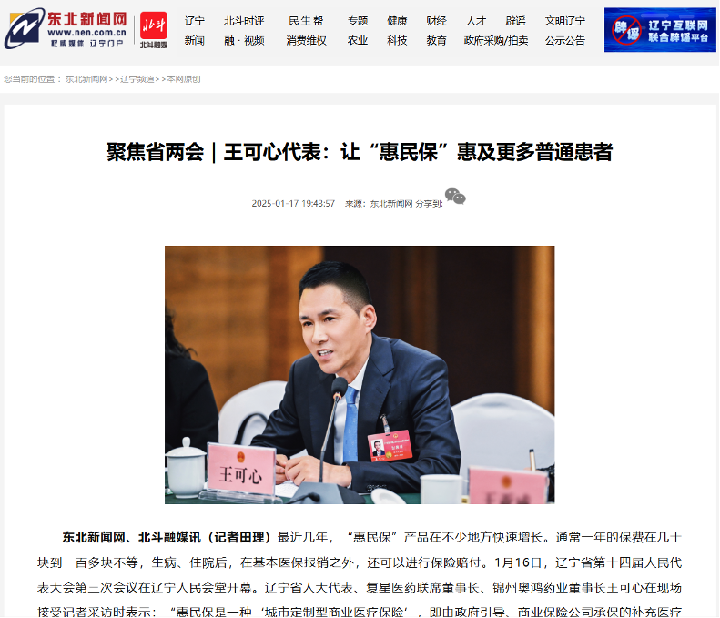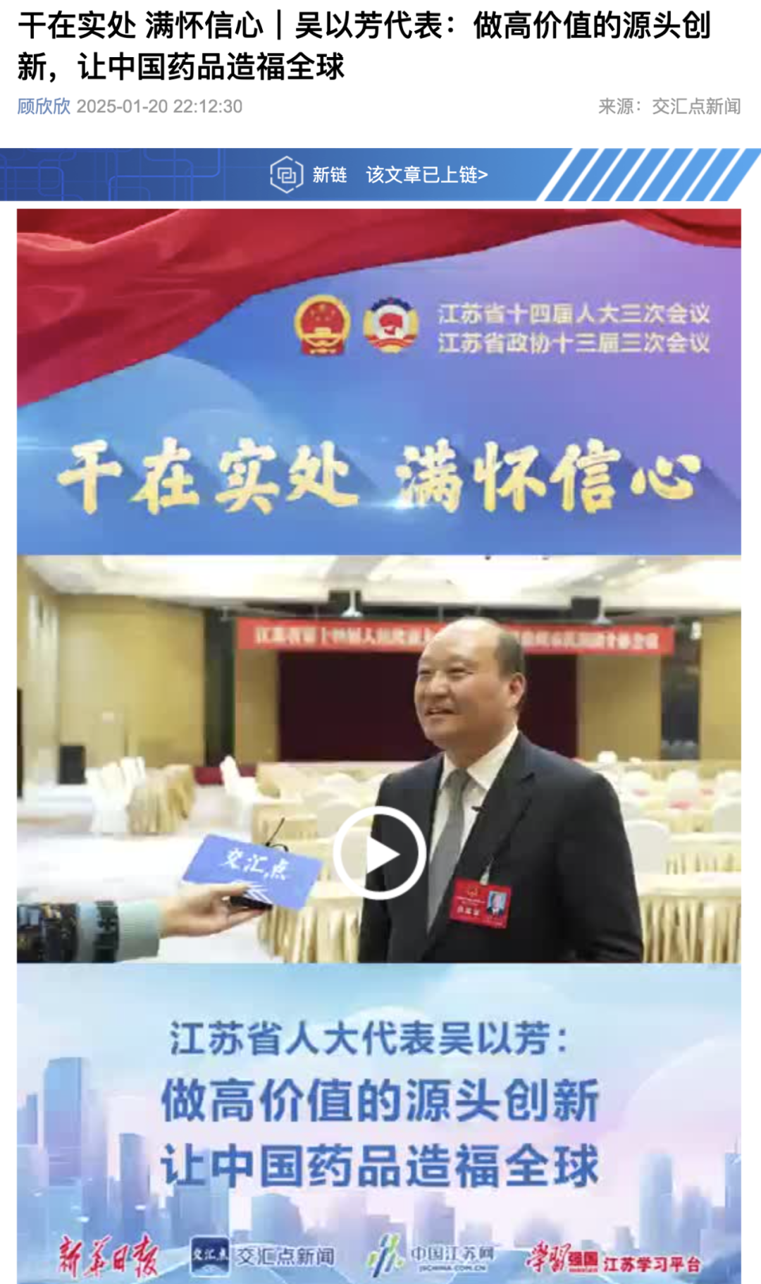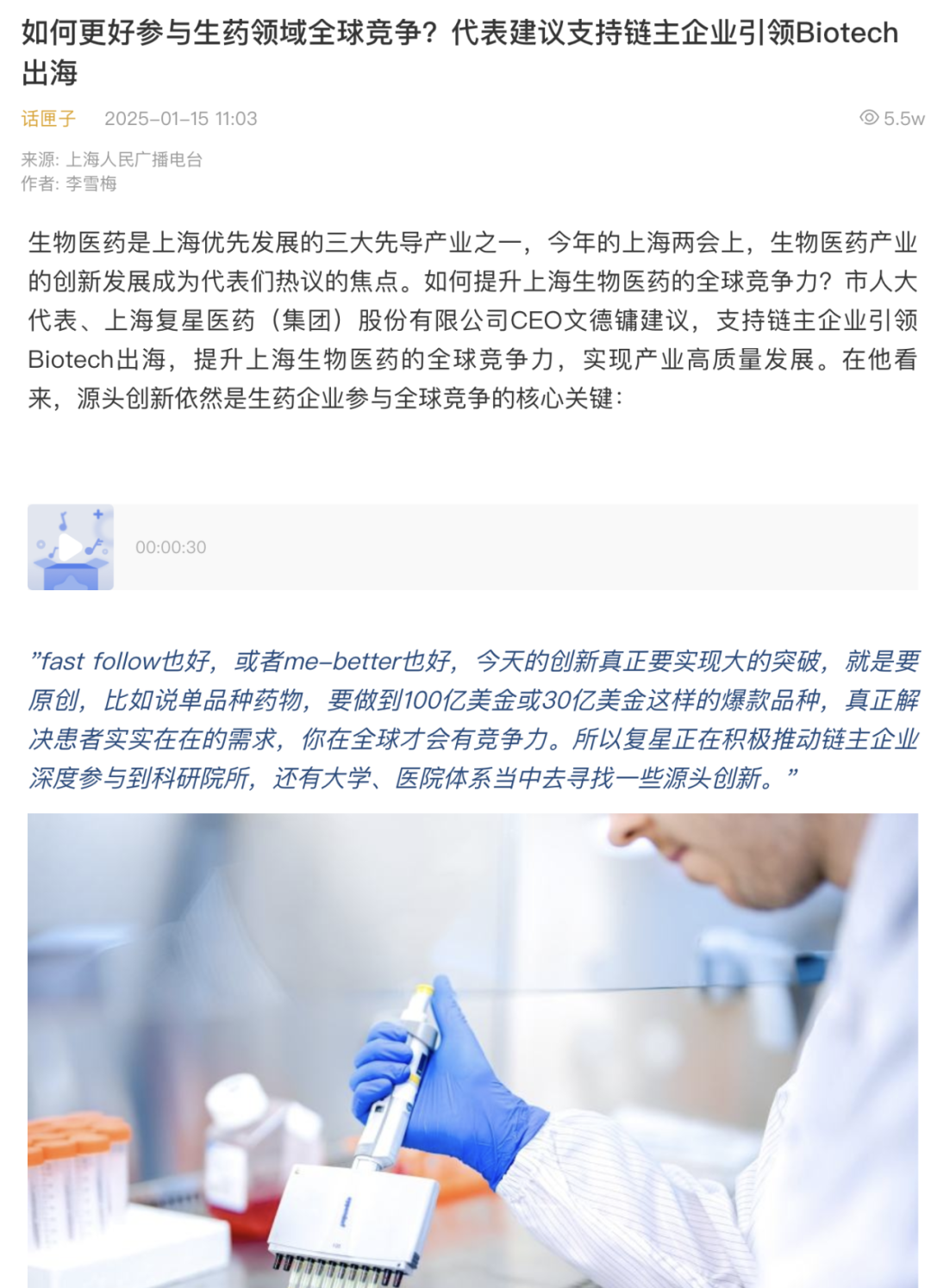 两会聚焦 2025 ![]() ![]() 2025年全国地方两会期间,复星医药董事长吴以芳、联席董事长王可心以及CEO文德镛作为人大代表分别出席了江苏省、辽宁省、上海市地方人大会议,聚焦产业发展及民生保障提出多项报告建议,切实以自身专业能力及影响力为生物医药行业及民生建言献策,让我们一起看一下媒体对于相关建议的报道吧~ 江苏省人大代表、复星医药董事长吴以芳表示,2025年是实现“十四五”规划收官之年,聚焦高质量发展是首要任务,生物医药领域新质生产力的形成,核心要素是创新。我们将积极响应,持续加大在江苏的创新投入,特别是在生物医药、高端医疗器械等领域,培育壮大产业。同时,进一步关注未被满足的医疗需求,聚焦“一老一小”的健康保障,建议启动针对江苏省60岁以上老人和5岁以下儿童“一老一小”开展流感疫苗接种的专项工作,为人民健康保驾护航。 ![]() 江苏卫视 | 江苏省人大代表 吴以芳:做高价值源头创新和全面国际化、深度国际化 ![]() 新华日报 | 吴以芳代表:为“一老一小”免费接种流感疫苗 ![]() ![]() 扫码观看报道 ![]() 新华日报 | 干在实处 满怀信心 吴以芳代表:做高价值的源头创新,让中国药品造福全球 ![]() ![]() 扫码观看报道 ![]() 徐州日报 | 构建跨区域产学研医创新联合体——访市人大代表、上海复星医药(集团)股份有限公司董事长吴以芳 ![]() ![]() 扫码观看报道 辽宁省人大代表、复星医药联席董事长、锦州奥鸿药业董事长王可心表示,政府积极推动医药产业创新模式转化,提高科研创新成果本地转化能力、加速高价值创新药落地,将高效推动辽宁省生物医药产业集群向更高价值领域跃迁。同时王可心代表还专门提交建议,辽宁省以现有医药产业为基础,宜大力发展“惠民保”项目、培育“惠民保”市场,以提升创新药械的可及性,促进本地创新药械的发展壮大,这对保障人民群众生命健康、推动生物医药产业发展具有重要意义。王可心代表的提案,引发各大媒体广泛关注。 ![]() 新华社 | 辽宁省人大代表王可心:以多元支付助力生物医药创新发展 ![]() ![]() 扫码观看报道 ![]() 东北新闻网 | 聚焦省两会 王可心代表:让“惠民保”惠及更多普通患者 ![]() ![]() 扫码观看报道 ![]() 辽宁电视台 | 《第1时间》 人大会侧记 上海市人大代表、复星医药CEO文德镛表示,上海在生物医药的创新发展上有先发优势,未来希望能够进一步加入到产业创新发展,深化落实上海先导产业战略和国家战略。他提出了两项重要建议,建议通过落实多元化支付实施细则,促进生物医药创新可持续。同时支持链主企业引领Biotech出海,提升上海生物医药的全球竞争力,实现产业高质量发展。 ![]() 澎湃新闻 | 两会对话 复星医药CEO:落实多元化医疗支付渠道,期待丙类药品目录后续推进 ![]() ![]() 扫码观看报道 ![]() 上海人民广播电台 | 如何更好参与生药领域全球竞争?代表建议支持链主企业引领Biotech出海 ![]() ![]() 扫码观看报道 ![]() 上海证券报 | 2025上海两会追新 ![]()