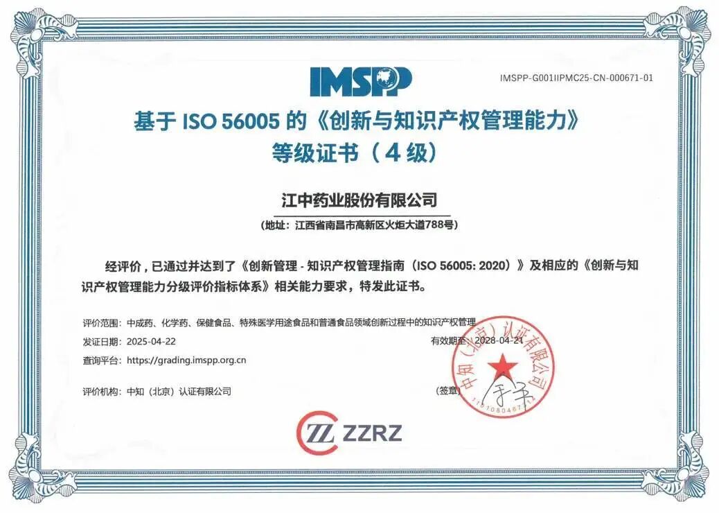 江中药业获中医药行业首张、江西省首张ISO56005《创新与知识产权管理能力》4级证书![]() ![]() 近日,江中药业股份有限公司通过《创新管理——知识产权管理指南(ISO56005:2020)》国际标准评价,成功获得基于ISO56005的《创新与知识产权管理能力》等级证书(4级),系中医药行业首张、江西省首张4级证书,也是该标准目前最高等级证书。 ![]() ISO56005创新与知识产权管理体系是国家知识产权局与工业和信息化部联合推广的标准体系,是我国提出并推动制定的首个国际知识产权管理标准。该体系强调知识产权战略、创新战略与业务战略的协同,适用于各类型企业提升知识产权管理效能和创新能力,旨在打造知识产权强企。此次江中药业获评的4级认证,是目前国内评出的最高级别认证,代表公司的科研创新与知识产权管理体系具备标准中“系统级”的体系与能力,实现了知识产权管理与创新管理的全面深入融合。 江中药业始终秉持“科技创新促进发展 知识产权保驾护航”的知识产权引领方针,聚焦专利和商业秘密管理、商标和字号管理、知识产权维权以及知识产权风险防范四大方面工作,进一步构建了“全程管控、全域协同”的创新管理体系,并先后获得“国家知识产权示范企业”、江西省专利奖等多项知识产权荣誉。 下一步,江中药业将继续锚定“战略协同、精准布局、价值实现”三大目标,通过系统化联动高价值专利培育与专利导航工程,构建覆盖“研发—保护—转化—运营”的全周期管理体系,助力企业改革深化和创新发展,大力推动中医药行业创新成果的保护与转化进程。