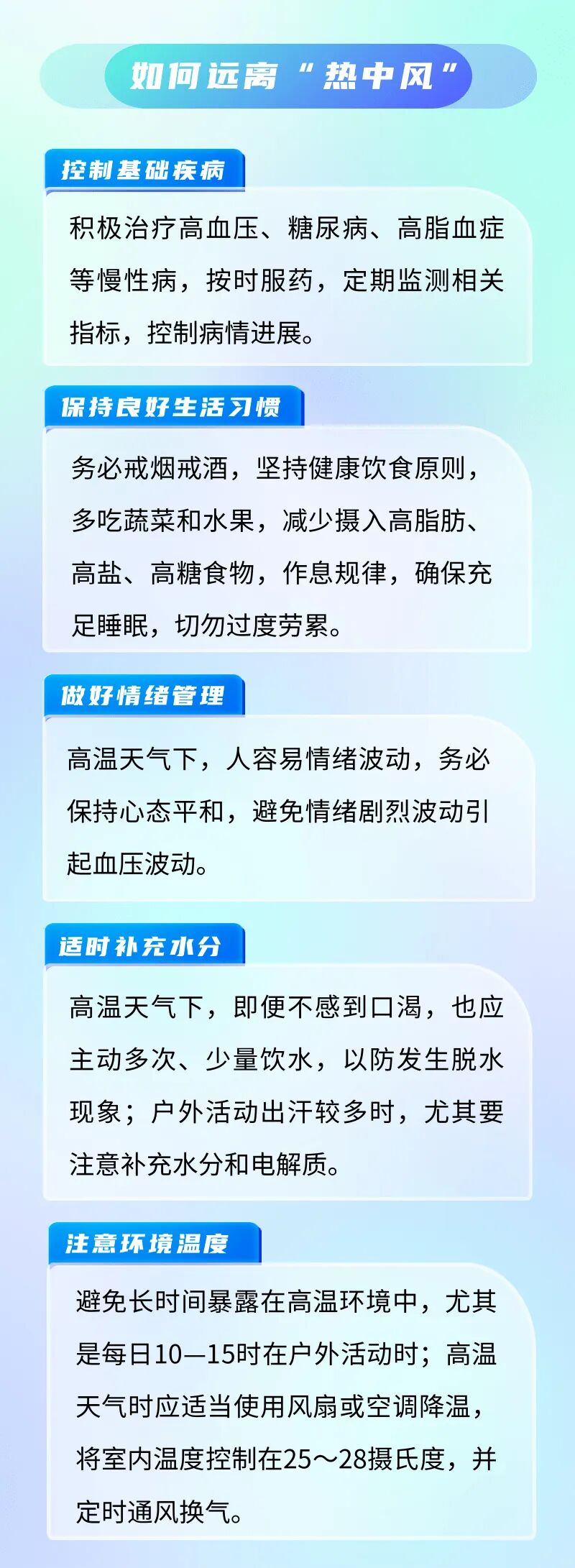 头晕乏力……当心“热中风”来袭!![]() 大太阳底下,突然感到头晕乏力、精神不振……小心!这可能不是普通中暑,而可能是“热中风”的警报。 什么是“热中风”?它有什么症状?它和普通中暑有什么区别? “热中风”究竟是怎么回事 “中风”是卒中的俗称,“热中风”是指在高温天气(气温超过32摄氏度)下出现的卒中事件。研究表明,极端高温天气和极寒天气都会增加脑血管疾病的发生风险。 根据卒中引起的出血或缺血的异常状态,一般可将其分为缺血性卒中和出血性卒中,“热中风”中的大多数属于缺血性卒中。 “热中风”的发生机制包括血液浓缩、血管失控及血压波动等。在炎热天气下,人体出汗增多,血管扩张明显,若水分补充不及时,容易导致血容量不足,在血液浓缩的情况下,血小板易于聚集,这会增加血栓的形成风险。而高温容易导致人心情烦躁、易怒,从而引发血压波动,也可能诱发卒中。 另外,夏季频繁进出空调房间或让冷风直吹头面部,会使血管迅速收缩或扩张。老年人的血管弹性较差,受冷刺激易引发血管痉挛。这些因素相互叠加,导致高温天气成为卒中发作的重要诱因。 不要将“热中风”当作中暑 “热中风”本质上是卒中的一种类型。它是在高温环境下发生的脑血管意外,一般表现为 突发的局部神经功能缺损,如偏瘫或偏身麻木(一侧肢体明显); 言语表达障碍,或理解困难、言语含糊; 口歪眼斜或流涎,步态不稳。 如出现上述一种或多种症状,请迅速拨打急救电话或及时就医。“时间就是大脑”,1分钟的延误就可能导致大脑中190万个神经元细胞的死亡。 而中暑者最早出现的症状是脸红、眩晕,之后会表现为高热,出汗少甚至无汗,严重时可能昏迷,但无特定偏侧症状。 所以,区分“热中风”和中暑的关键,在于观察患者是否有局部神经功能受损的表现(如偏瘫),以及体温是否异常升高。在高温天气下,一旦出现头晕、偏侧肢体无力等症状,切勿自行诊断为普通中暑,这可能会延误治疗时机。 这些人群需要提高警惕 高血压、糖尿病、高脂血症等疾病可能会引起脑血管狭窄,这些疾病可能是诱发卒中的先决条件。65岁以上人群的体温调节中枢可能不灵敏,对体内缺水的反应能力降低,可能诱发卒中。 太阳直射下进行长期的户外活动,可能带来脱水风险。有些老年人怕吹风,在高温天气不使用风扇或空调,也可能面临脱水风险。这些因素都会导致血容量减少,血流减缓,为血栓形成创造条件,增加卒中的发生风险。 长时间过度依赖空调或空调温度过低,导致室内外温差过大,也会导致血管不规律收缩与扩张、血压升高,进而增加卒中的发生风险。另外,有不良生活习惯的人群,如有吸烟、过量饮酒、缺乏运动、饮食不健康等习惯者,发生“热中风”的风险会大幅增加。 遇到“热中风”该怎么办 当身体出现预警信号时,可以按照“FAST”口诀进行检查。 对着镜子笑,观察面部(Face),看口角是否对称; 双侧手臂(Arm)平举10秒,检查是否有单侧下垂; 重复短句如“吃葡萄不吐葡萄皮”,聆听发音(Speech)是否清晰; 如有任何一项异常,请立即拨打急救电话,明确告知怀疑卒中、患者发病的具体时间,切勿等待观察病情,延误治疗时机(Time)。 卒中发生后的4.5~6小时是救治的黄金期。静脉溶栓及动脉取栓治疗能够最大程度减轻脑部损害,使致残率降低40%。在等待救护车到来时,应注意使患者保持平静,避免情绪激动,禁食、禁水,以防窒息。 如果遇到疑似“热中风”患者,首先要观察患者是否有意识(能够回应),之后应用“FAST”口诀进行检查,帮忙拨打急救电话并记录患者的发病时间。在等待急救人员到来时,尽量不要移动患者,以免使其病情加重。如果患者呕吐,应确保其头部偏向一侧,防止呕吐物被误吸。不要擅自给患者喂食物、水或药物。及时、高效的治疗是改善患者预后,减少病死率、致残率的关键。 ![]()