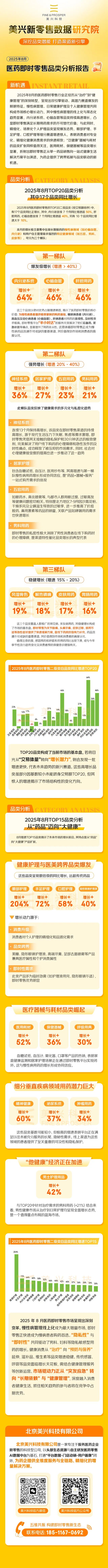 医药即时零售品类分析报告![]() 医药零售市场增长放缓,2024 年药品整体规模增速仅 0.8%,B2C 渠道增长 4.7%、增速放缓,O2O 则以 35% 增速保持强劲。 政策层面,医保线上支付体系持续完善,带动即时零售在慢病领域销售增长。消费端变化显著,急用药、隐私保护类药品需求上升;消费者习惯变迁,健康管理意识增强,更倾向 “线上下单、线下即时配送” 购药模式,且对用药咨询、健康监测等增值服务需求提升。各大平台借智能备货、AI 问诊及下沉市场布局,构建 “用药 + 检测 + 保险” 一体化健康服务生态,助推医药即时零售发展。 行业呈现需求升级、技术赋能、政策支持与资源互补趋势。在此背景下,中国非处方药物协会信息传播工作委员会与美兴科技合作开展即时零售品类信息发布项目,旨在推动行业与科技深度融合,以数字化优化 OTC 信息传播生态,满足公众健康需求、赋能行业升级,有望成为 2025 年医药数字化领域重要突破,助力 OTC 市场规范高效发展。